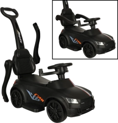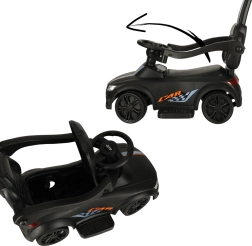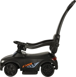 Macchinina spingi–cavalcabile 3in1 nera cresce con il bambino dai 12 mesi: offre maniglione di guida per i genitori, barre di sicurezza e schienale per le prime uscite e la possibilità di smontaggio graduale per il cavalcabile autonomo. Realistici effetti luminosi e sonori (con 3× AA) trasformano ogni giro in un’avventura divertente.