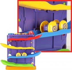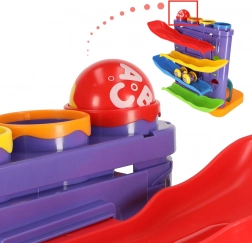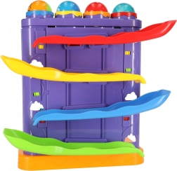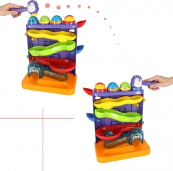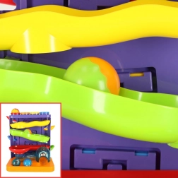 Divertente e colorata pista a biglie 3 in 1 per bambini dai 3 anni, con due circuiti separati: uno per le biglie e uno per la macchinina. Con il martelletto i bambini fanno partire le biglie dai fori superiori e ne osservano la discesa. Il gioco sviluppa la motricità fine, la coordinazione occhio–mano e spiega in modo naturale i principi della gravità. Inclusi 4× biglie, macchinina e martelletto.