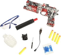 La pistola elettrica per il divertimento spara due tipi di munizioni: dardi in gommapiuma e sfere idrogel. La confezione include sfere da preparare separatamente: occorre immergerle in acqua per 3-4 ore affinché aumentino di volume.