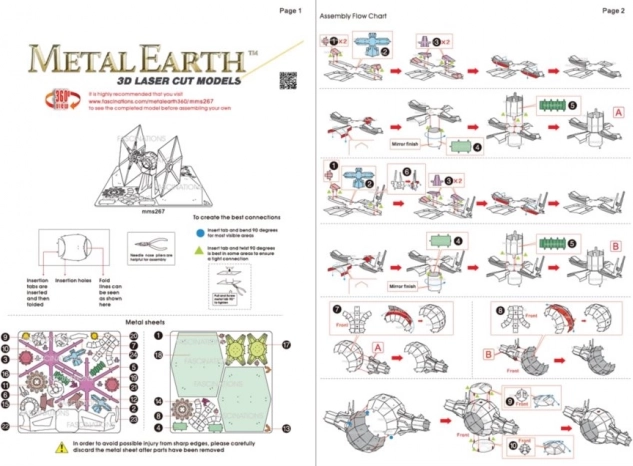 Rimuovi i singoli pezzi dai fogli metallici; se necessario usa piccole tronchesine (non incluse). I pezzi si collegano tra loro tramite incastri composti da una linguetta e un foro. Piega la linguetta con piccole pinze a becchi sottili (non incluse) e unisci progressivamente tutti gli incastri fino a ottenere un pezzo maestro dall’aspetto molto realistico!