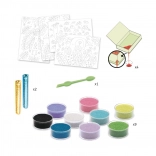 Il set contiene: 4 quadri, 1 spatolina, 9 barattolini di sabbia colorata e 2 tubetti di glitter scintillanti.