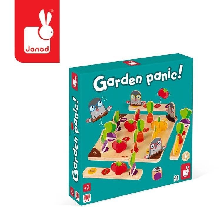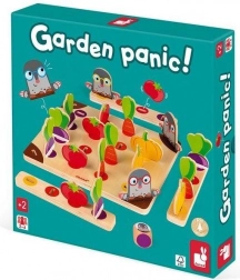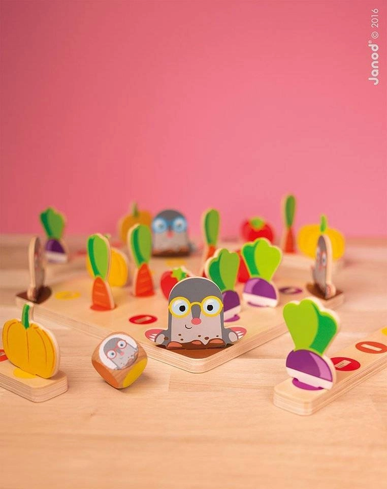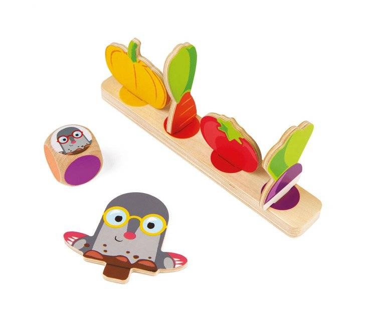 Questo gioco da tavolo in legno mette i giocatori nei panni di giardinieri: sul tabellone crescono colorate “aiuole” di pomodori, carote, zucche e barbabietole e agli angoli si nascondono le talpe. Si lancia il dado: il colore indica il prodotto da mettere nel cestino, mentre la talpa blocca temporaneamente il raccolto. Vince chi per primo raccoglie un pezzo per ciascun tipo.