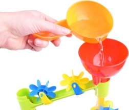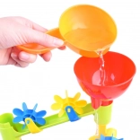 Versa l’acqua direttamente nell’imbuto superiore: il flusso scorrerà lungo i percorsi facendo girare tutti i mulini colorati.
