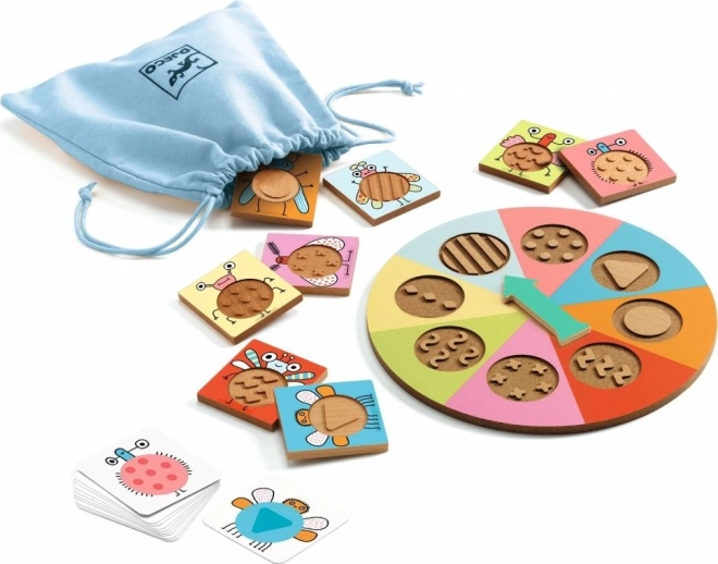 Il gioco Djeco Tactil Bzzz è progettato per bambini che stanno imparando a riconoscere diverse strutture e forme attraverso il tatto. Le regole del gioco sono semplici: Un giocatore gira la ruota e un altro giocatore cerca di trovare la tessera corrispondente usando solo il tatto. L'obiettivo è raccogliere il maggior numero di carte insetto.