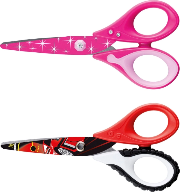 Le forbici hanno punte arrotondate per una maggiore sicurezza e impugnature ergonomiche. La variante Boy colpisce per la texture che ricorda uno pneumatico, mentre la variante Girly presenta strass decorativi. Foto illustrativa – colori e motivi sono forniti casualmente in base alle scorte disponibili.