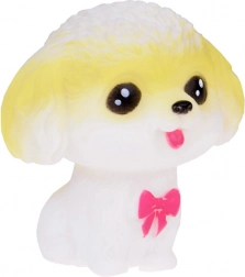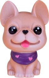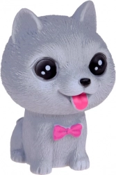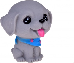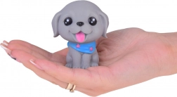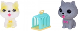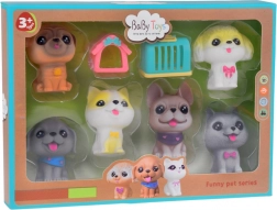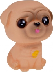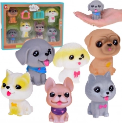 Ogni cane emette un divertente suono di squittio quando viene premuto e ha un piccolo foro nella parte inferiore. Il set include diverse razze come bulldog, shiba inu, barboncino, bracco tedesco, carlino e chihuahua a pelo corto, ognuno con adorabili accessori propri. Include anche una piccola cuccia e un trasportino.