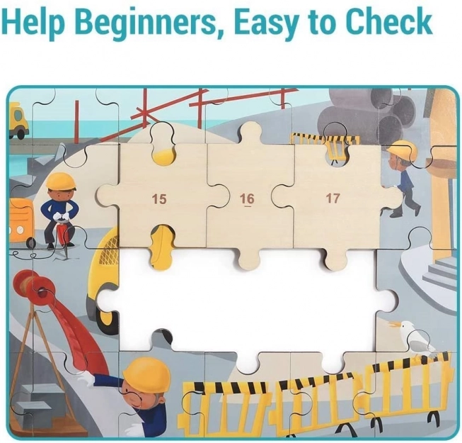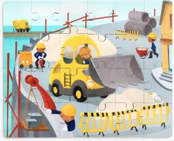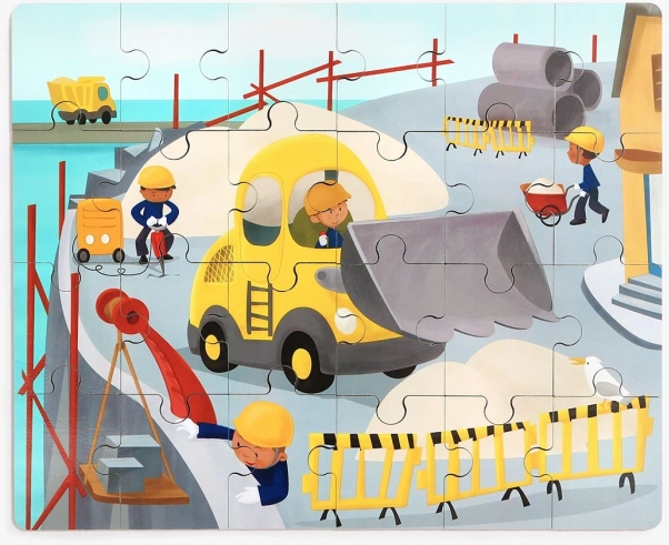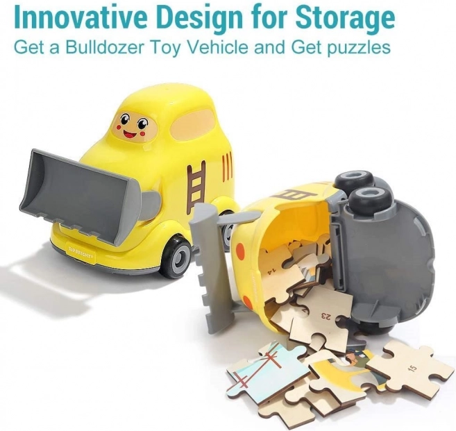 Scopri un giocattolo intelligente che unisce il divertimento all'apprendimento. Il puzzle in legno a tema mezzi di trasporto (cantiere) è nascosto direttamente nel bulldozer di plastica. Quest'ultimo ha una finitura liscia e sicura, ruote per muoversi e un coperchio inferiore apribile, in cui i bambini possono riporre comodamente il puzzle o i loro tesori.