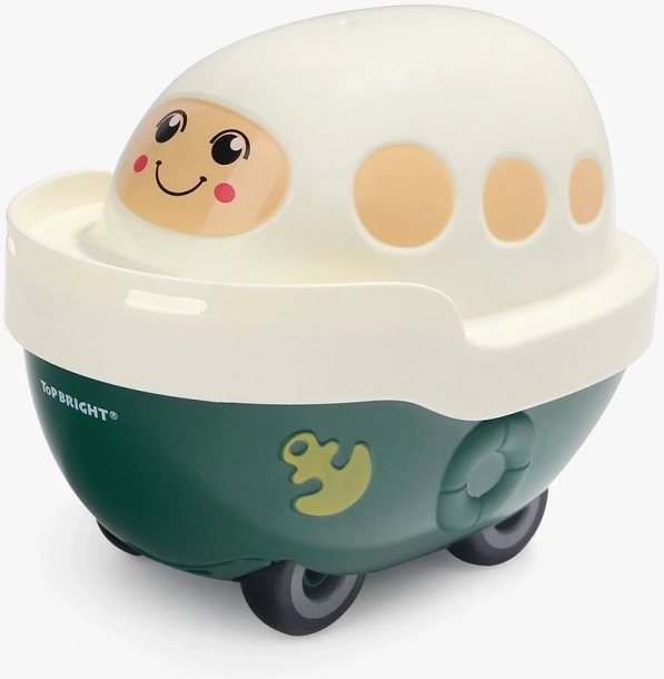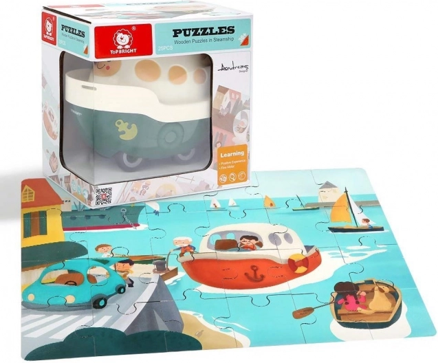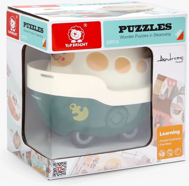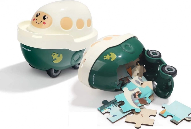 La barchetta di plastica con un grazioso viso è un giocattolo completamente funzionale. Il coperchio inferiore si apre e contiene l’intero puzzle o altri piccoli tesori.