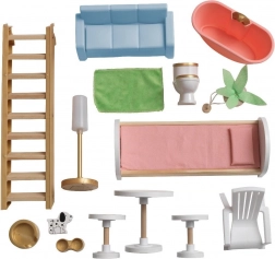Subito pronta per giocare – letto, divano, vaschetta, tavolini, sedie e altre miniature per arredare realisticamente ogni stanza.