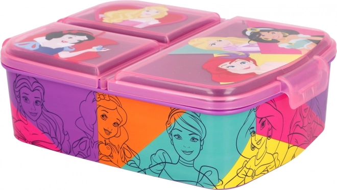 Pratico lunch box con motivo DISNEY Principesse che offre tre scomparti separati per riporre il cibo in modo ordinato. Realizzato in materiale resistente, privo di BPA e con licenza ufficiale, farà felice ogni piccola principessa. Ideale per la scuola, il parco giochi e le gite.