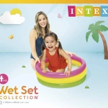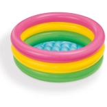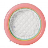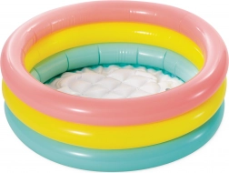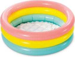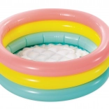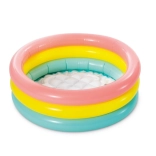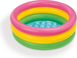 Tre anelli gonfiabili in tonalità vivaci di rosa, giallo e verde rendono la piscina attraente e invitano i bambini a giocare.
