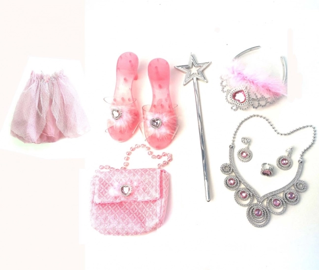 - Gonnellina, scarpette, corona, borsetta, bacchetta magica, gioielli