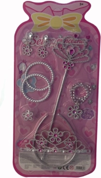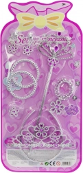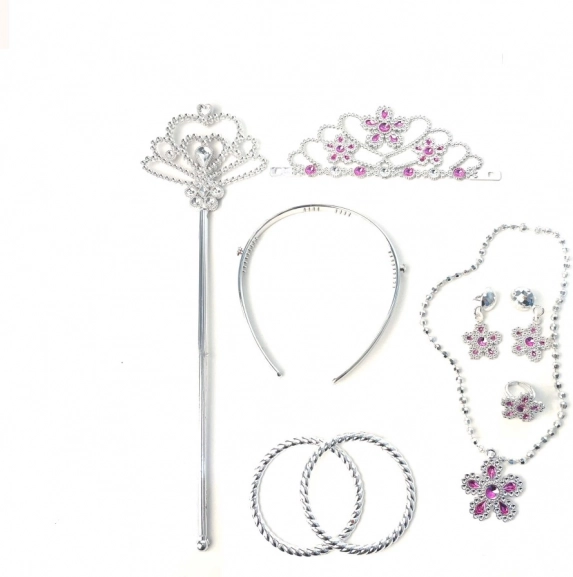 A seconda della versione, oltre a corona, bacchetta, orecchini e braccialetti, il set può includere anche una collana, un anello o un cerchietto – tutto nello stesso stile da principessa.