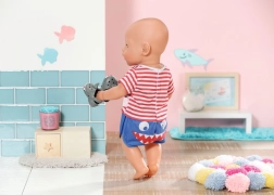 Regala alla tua bambola un addormentarsi con stile con il pigiama BABY born dal tema oceanico. La maglietta a righe rosse e bianche con squalo e il pezzo inferiore blu con il sorriso dello squalo faranno sorridere ogni piccolo caregiver. Le scarpette grigie a forma di squalo completano perfettamente l’outfit e stimolano il gioco di fantasia.