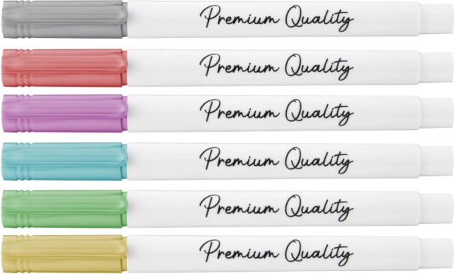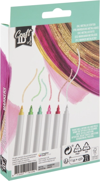 Scopri le possibilità creative con questo set di sei pennarelli metallizzati Craft. Grazie ai pigmenti ricchi, i colori hanno tonalità intense e vivaci, perfette sia per disegni dettagliati sia per coperture uniformi di superfici più ampie. Crea illustrazioni originali, decorazioni e bigiotteria fatta a mano senza limiti alla fantasia.