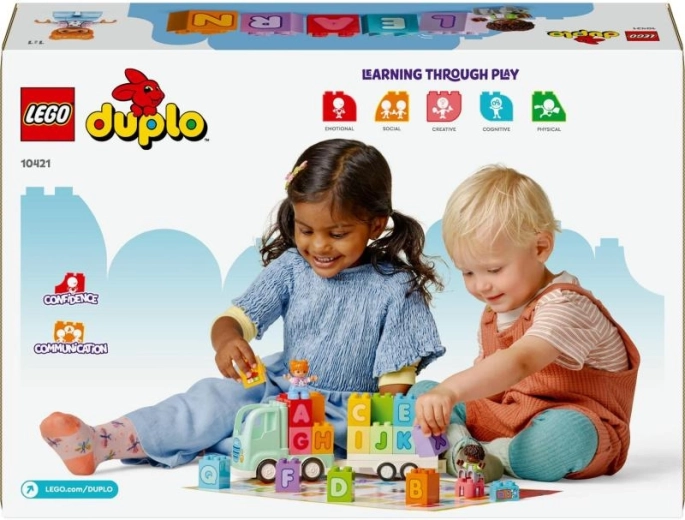 Il set LEGO DUPLO Camion con alfabeto offre ai bambini un modo divertente per scoprire le lettere. Grazie ai pezzi grandi e facili da afferrare, i più piccoli imparano colori, lettere e la composizione di semplici parole mentre esercitano la coordinazione occhio‑mano. Il camion mobile con rimorchio staccabile e due personaggi invita al gioco narrativo aperto.