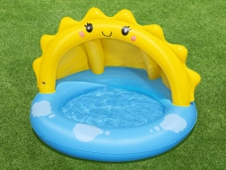 La piscina si distingue per un design allegro con un sole giallo e sfondo blu con nuvole, che cattura l'attenzione di ogni bambino.