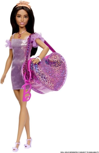 La borsa attraente si distingue per il tessuto lucido e i dettagli che imitano gli adesivi, offrendo a Barbie un look eccezionale in viaggio.