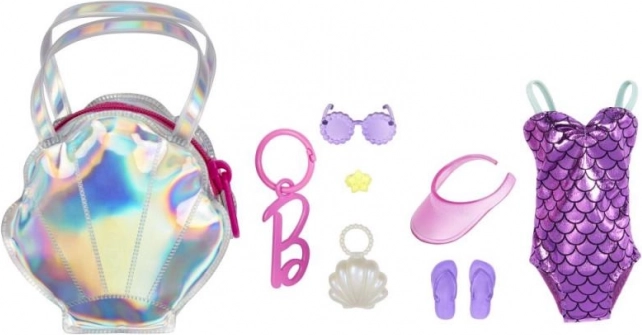 Scopri la fantastica moda di Barbie con il nostro set di moda premium, che include un elegante abito a righe e cinque accessori! Tutto è nascosto in una borsa pratica per le avventure quotidiane.