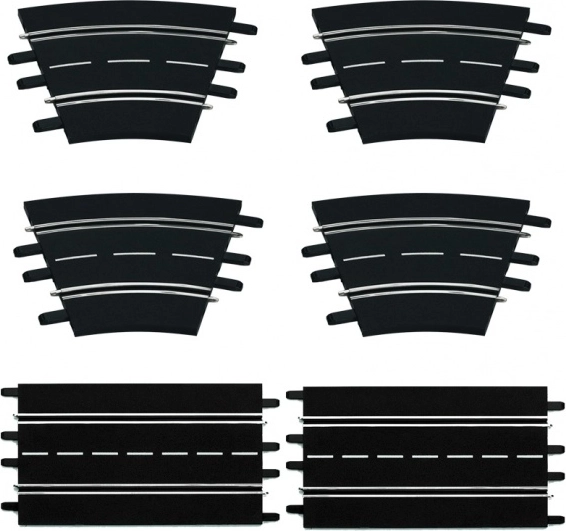 Il contenuto della confezione è progettato per garantire una guida fluida, collegamenti solidi tra i pezzi e una costruzione del tracciato versatile. Crea rettilinei più lunghi, percorrenze in curva più precise e connessioni tra segmenti stabili.