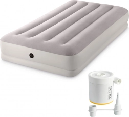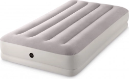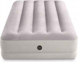 Il letto gonfiabile INTEX combina materiale PVC resistente con una superficie floccata morbida, piacevole al tatto e che migliora il comfort del sonno. La struttura rialzata con camere longitudinali e rinforzi interni garantisce stabilità senza effetto dondolio e un supporto affidabile della colonna vertebrale.