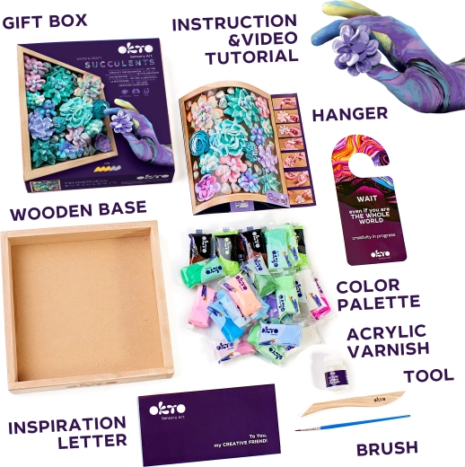 Set creativo per gli amanti del fai da te e i principianti. Crea succulente realistiche con pasta autoindurente ed esponile nell’elegante cornice in legno 21 × 21 cm. La confezione include tutto il necessario – pasta, strumento per modellare, pennello e guida illustrata – basta aprire e iniziare a creare.