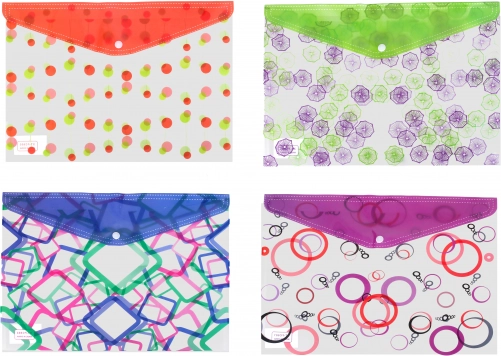 Una cartella pratica con bottone a pressione di dimensioni 35x25 cm, ideale per l'organizzazione e la conservazione di documenti e fogli. Disponibile in quattro diversi motivi.