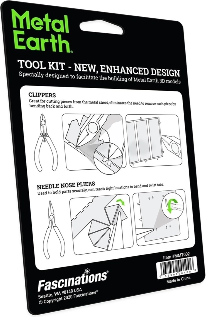 Il set di pinze METAL EARTH è un accessorio adatto non solo per l’assemblaggio dei puzzle 3D METAL EARTH. Contenuto della confezione: - pinza tronchese, - pinza a becchi sottili. Questi utili strumenti sono ideali durante l’assemblaggio dei modelli puzzle in acciaio 3D METAL EARTH, per staccare i pezzi dalle lastre metalliche e per piegare le piccole linguette che collegano tra loro i singoli pezzi.