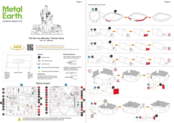 Rimuovi i singoli pezzi dai fogli metallici; se necessario, utilizza piccole tronchesine (non incluse). I pezzi si collegano tramite linguette e fori. Piega le linguette con piccole pinze a becchi sottili (non incluse) e unisci progressivamente tutte le chiusure fino a ottenere un capolavoro estremamente realistico!