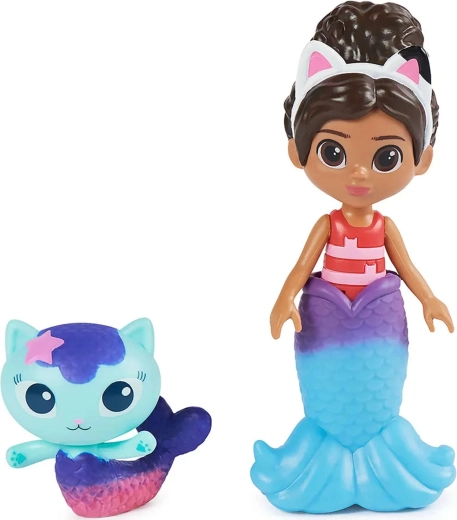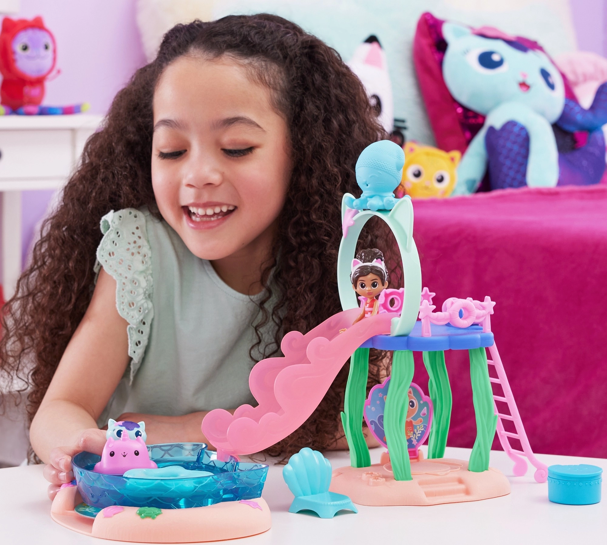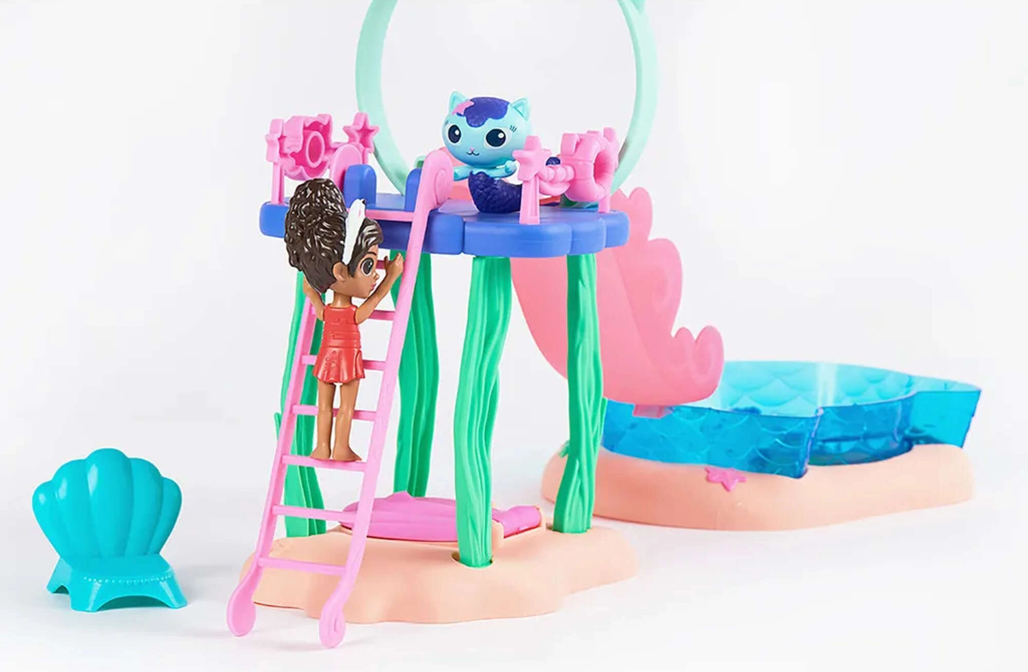 - Figure di Gabby con coda marina rimovibile, figura della Sirenina, scivolo, piscinetta, scaletta, conchiglia con immagine, nebulizzatore “polipo”, galleggianti, Posta dei Gattini con minifigurina e codice QR