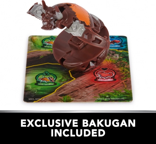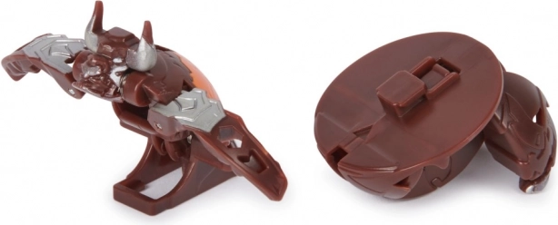 Un Bakugan marrone con dettagli argentati che, passando sulla carta portale, si apre in modalità combattimento: un'iconica trasformazione come nella serie.
