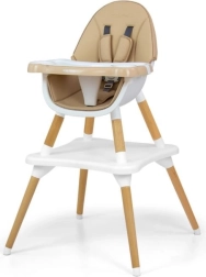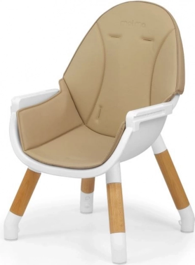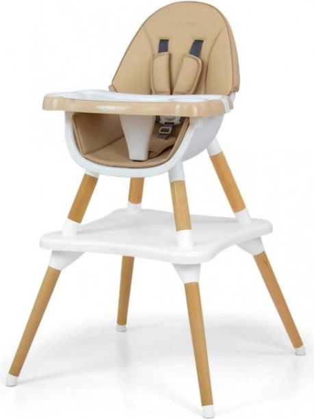La sedia può adattarsi all'età e all'altezza del bambino grazie alle cinture di sicurezza a cinque punti regolabili. È inoltre dotata di morbidi passanti per le spalle che proteggono dall'abrasione, e la tappezzeria in ecopelle è resistente alle macchie. Il vassoio con incavo impedisce agli oggetti di cadere.