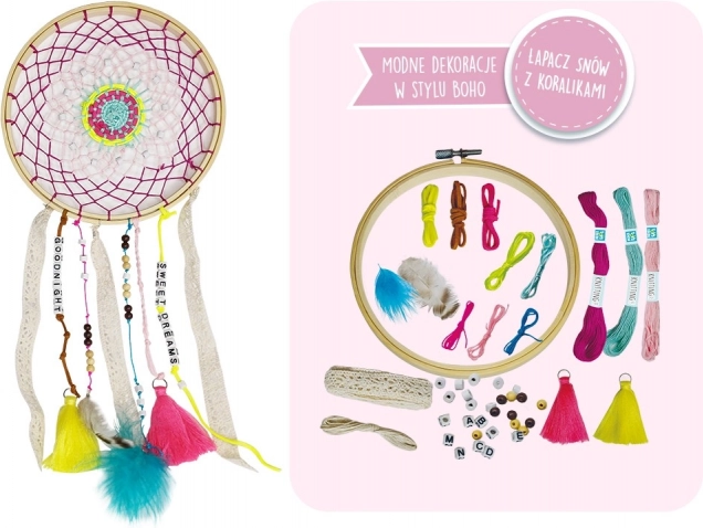 Crea il tuo acchiappasogni boho e libera la fantasia. Questo accessorio di stile sta benissimo sia sulla parete che alla finestra e grazie a 84 perline con lettere lo potrai decorare con scritte originali. La confezione include tutto il necessario per una creazione facile e una decorazione personalizzata per la cameretta dei bambini o la camera da letto.