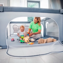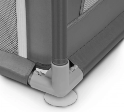 Il box offre uno spazio sicuro per il gioco senza elementi di disturbo all’interno – tutte le parti strutturali sono all’esterno. Le morbide pareti laterali in rete permettono al bambino di esercitarsi ad alzarsi, ai primi passi o a girarsi con rischi minimi, e al contempo offrono ottima visibilità ai genitori. Le pareti alte e robuste impediscono uscite involontarie, così il bambino dispone di uno spazio pulito e protetto per il divertimento quotidiano.