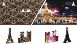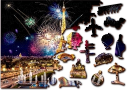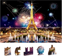 Il puzzle è double face (2in1): da un lato componi seguendo l’immagine colorata della notte parigina con fuochi d’artificio, dall’altro segui il motivo ripetuto guidandoti solo dalle forme dei pezzi. I bordi lisci senza schegge sono garantiti dalla lavorazione laser di precisione e dalla solida lastra HDF di spessore 3–4 mm. Nella confezione trovi anche un modello separato per un montaggio più confortevole.
