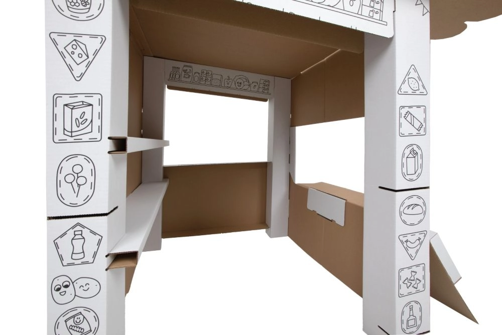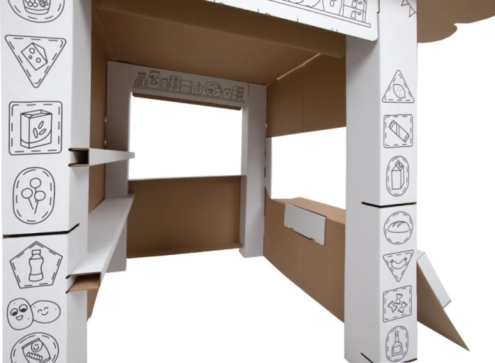 La struttura in cartone leggero si assembla senza attrezzi. Una volta montato, il chiosco è stabile e pronto per ore di gioco sicuro.