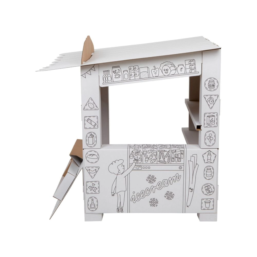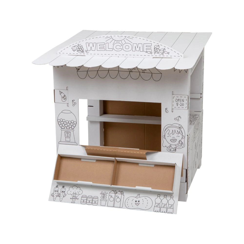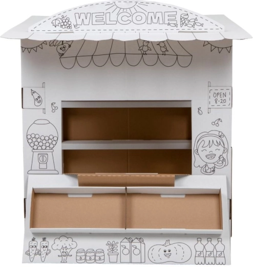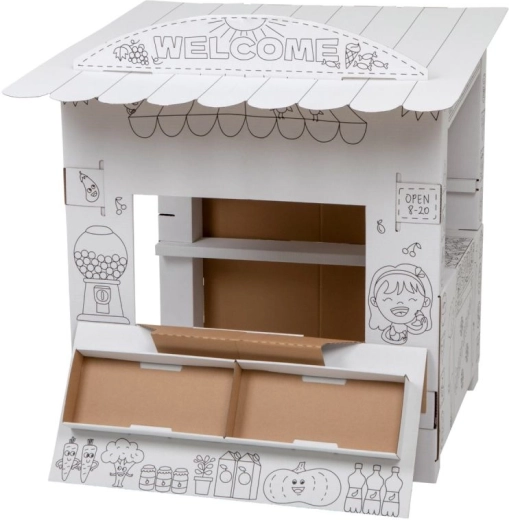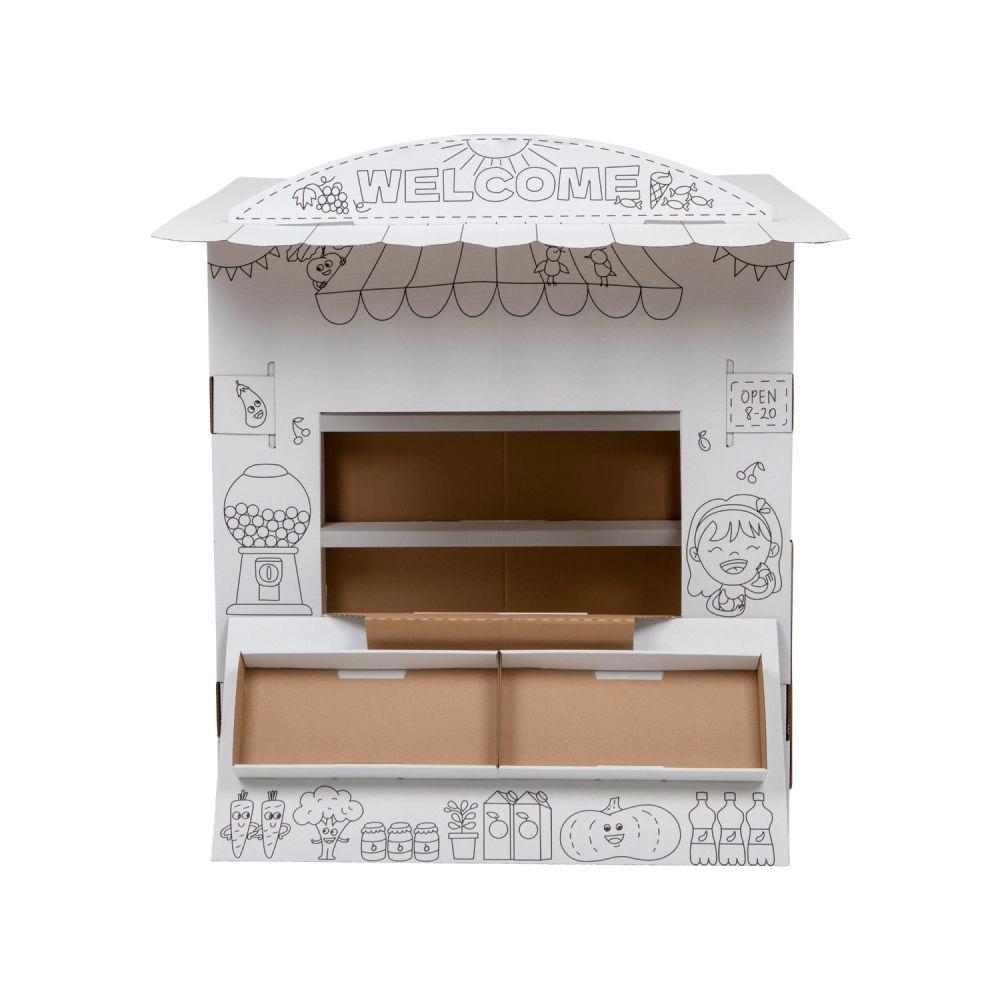 Questo chiosco in cartone offre ai bambini tanto divertimento e apprendimento in uno. Grazie ai contorni in bianco e nero, i bambini possono colorare con matite, pennarelli o pastelli a cera e creare il proprio chiosco di vendita originale. Il design aperto con bancone ribaltabile e scaffali interni è perfetto per il gioco del venditore e del cliente.