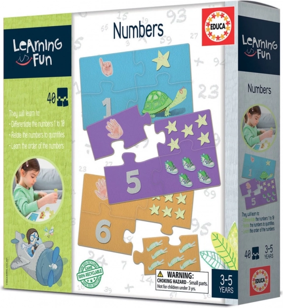 Scopri un modo giocoso per avvicinarti alla matematica con la linea EDUCA Learning is Fun. Questo set introduce i bambini ai numeri da 1 a 10, li aiuta a imparare il primo conteggio e collega la cifra, la quantità di immagini e le dita. A ogni numero corrispondono 4 tessere puzzle, che sviluppano motricità fine, pensiero logico e pazienza. Inoltre, il prodotto è 100% riciclabile.