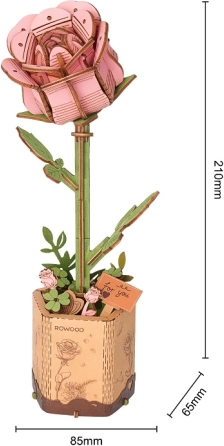 Questa elegante rosa in legno è un regalo perfetto e un accessorio d’arredo di stile. Grazie all’ingegnosa soluzione dei pezzi, il modello si assembla facilmente e risulta comunque molto realistico. Con bassa difficoltà e un tempo di costruzione di circa 30 minuti, il progetto è adatto a principianti, famiglie e appassionati creativi.