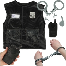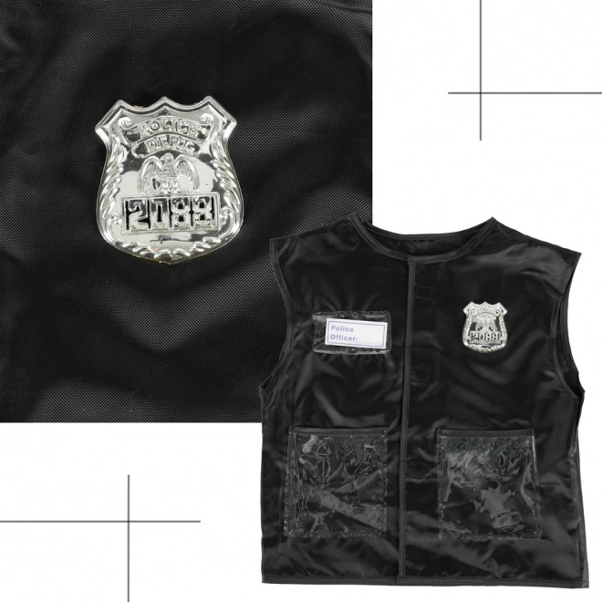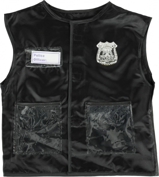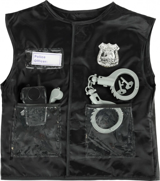 Il gilet ha tasche trasparenti, un distintivo argentato e una patch 'Police Officer', permettendo ai bambini di sentirsi come veri poliziotti.
