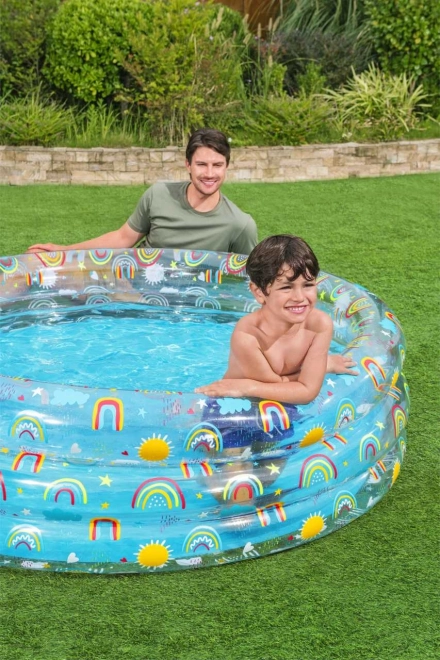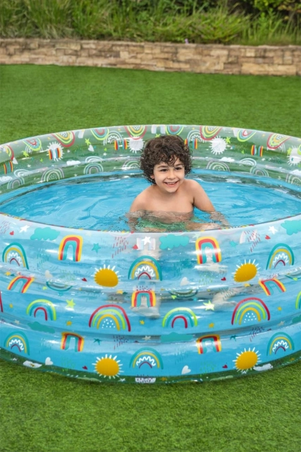 Con motivi di arcobaleno e sole, questa piscina non è solo pratica ma anche esteticamente gradevole, invitando i bambini a giocare.