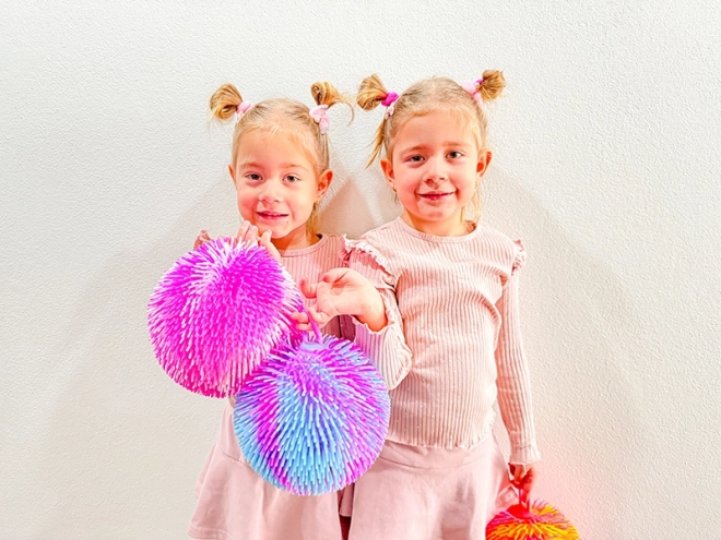 La pallina luminosa rosa‑bianca con frange è una scelta perfetta per un gioco attivo a casa e all’asilo. Ad ogni movimento si illumina, stimolando i bambini a continuare a giocare e muoversi. Le morbide “spine” offrono un piacevole feedback tattile e promuovono lo sviluppo sensoriale.