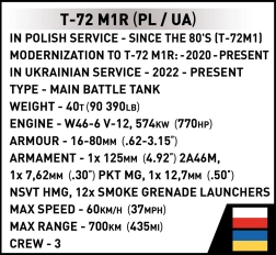 Il set COBI riproduce fedelmente il carro armato modernizzato T-72M1R utilizzato in Polonia e in Ucraina. In scala 1:35 si abbina perfettamente agli altri modelli della serie Armed Forces. Grazie al nuovo elemento speciale per le caratteristiche ruote di rotolamento, alla torretta girevole, al cannone mobile e ai cingoli funzionanti, ti divertirai sia in fase di costruzione sia nel gioco e nell’esposizione.