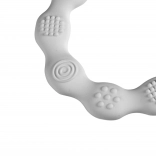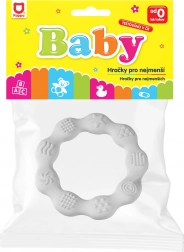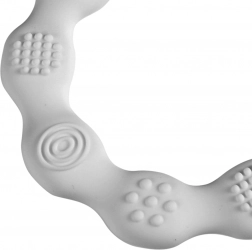 Pratico anello da dentizione in silicone di colore bianco che aiuta a calmare le gengive irritate durante la crescita dei dentini. Grazie alla forma ergonomica il bambino lo afferra facilmente e le strutture in rilievo sulla superficie offrono una delicata massaggio gengivale e una stimolazione sensoriale.