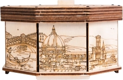 Incisioni dettagliate con scenari urbani e una superficie naturale liscia rendono la scatola un accessorio e una decorazione di stile.