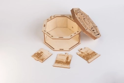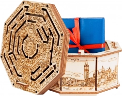 Secret Maze Box è una scatola in legno finemente realizzata con un ingegnoso meccanismo, perfetta sia come confezione regalo sia come elegante scrigno per oggetti di valore. Lo spazio interno di 10 × 10 × 4,5 cm contiene banconote, un anello, piccoli gioielli o un messaggio personale. L’apertura non è scontata: prima bisogna interpretare discreti indizi e azionare il meccanismo.