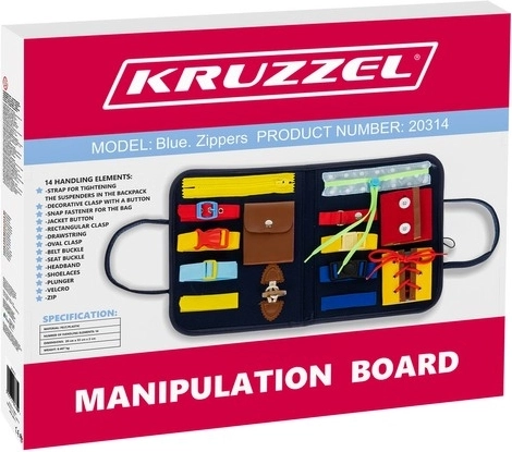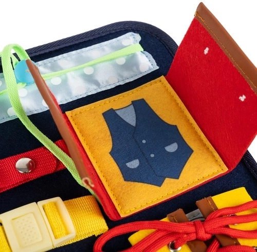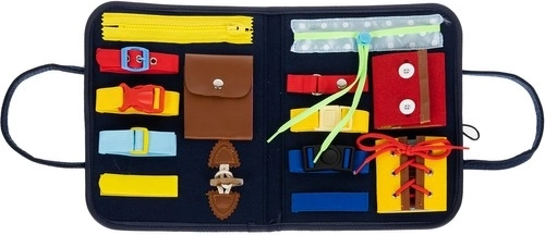 Include 14 elementi diversi, tra cui cerniere, fibbie, bottoni e altri, che supportano abilità pratiche e indipendenza.