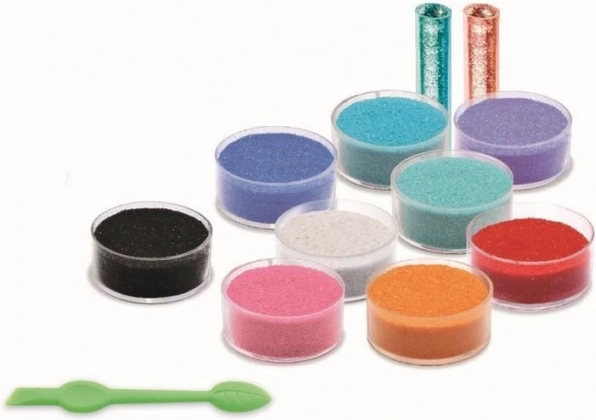 Scopri la magia della creazione con questo set creativo di DJECO, che permette ai bambini di creare immagini colorate e luccicanti. Usando una spatola speciale, rimuovono le aree adesive segnate e le cospargono di sabbia o glitter secondo i numeri.