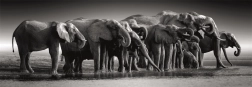 Un'imponente fotografia in bianco e nero di elefanti presso l'acqua dona all'immagine finita un aspetto senza tempo e si integra perfettamente in un interno moderno.