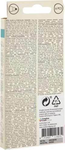 Pennarello per porcellana e vetro – con questo pennarello puoi dipingere su porcellana e vetro. I colori sono impermeabili. Lavabile in lavastoviglie. Istruzioni sulla confezione del prodotto.